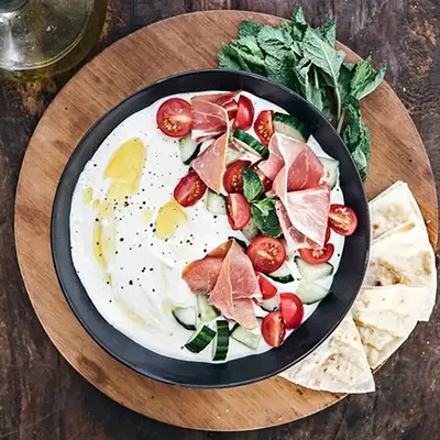 Ktipiti, légumes à la grecque et jambon cru Aoste « Les Fines et Fondantes »