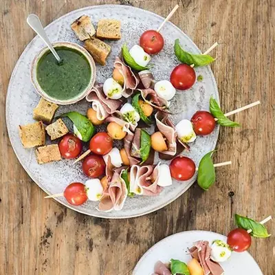 Brochettes estivales de jambon cru Aoste, melon, mozzarella et pesto noisette basilic