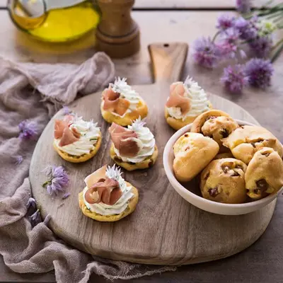 Gougères fromagères au jambon cru Aoste et crème montée à la ricotta