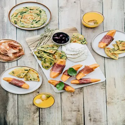 Planche apéro melon, mozzarella, jambon cru « Fines et fondantes » Aoste, basilic et pain aux cébettes