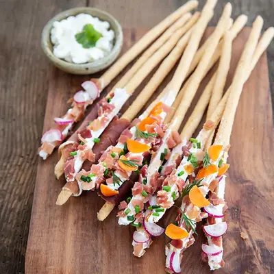 Gressins mikados fromage frais, radis, jambon cru, carottes