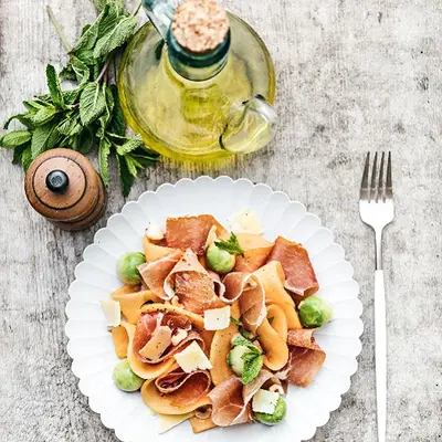 Voluté de Melon et jambon cru Aoste, billes d’avocat et copeaux de chèvre