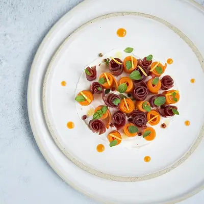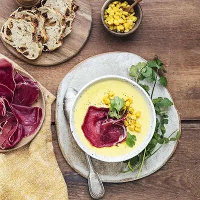 Soupe froide de betterave et son crostini au jambon Serrano Aoste Sélection