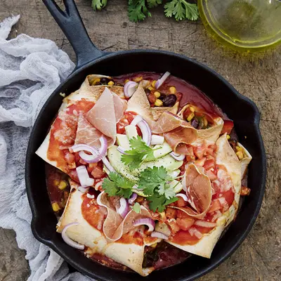 Enchiladas farce mexicaine, cheddar et jambon cru Aoste