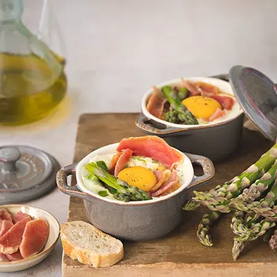 Œufs cocottes aux pétales de jambon cru comté et asperges