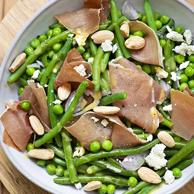 Salade de haricots verts, petits pois et jambon cru Aoste
