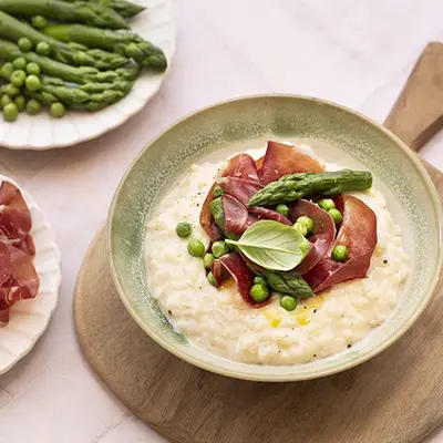 Risotto aux asperges et Dentelles de Coppa Aoste