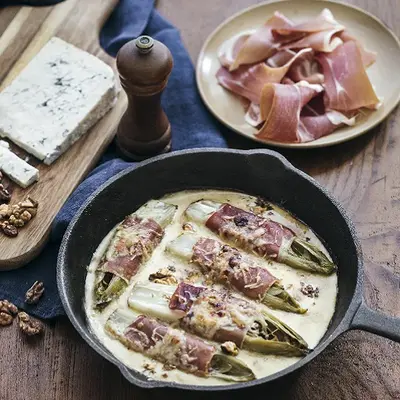 Endives au jambon cru « Les fines et fondantes Serrano» Aoste, sauce au gorgonzola et noix torréfiées