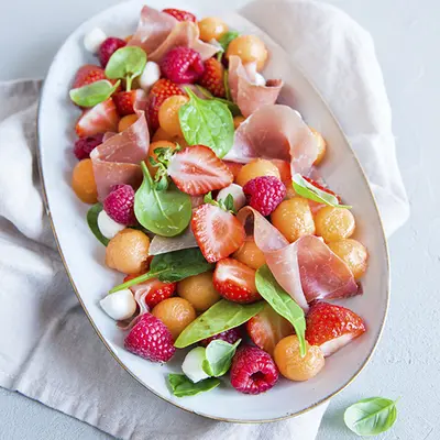 Salade de melon et fruits rouges au Jambon cru Aoste