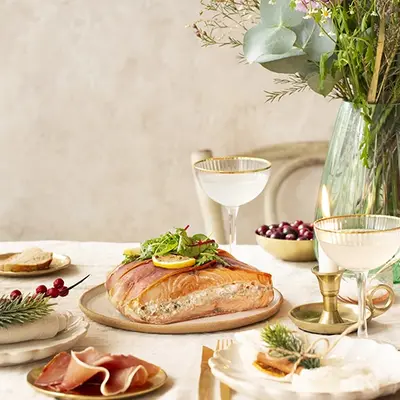 Rôti de saumon, pistaches, tomates confites, jambon cru Aoste et chèvre frais