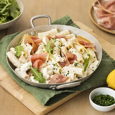 Rigatoni sauce ricotta et zeste de citron jaune, ciboulette et quart tranché Aoste
