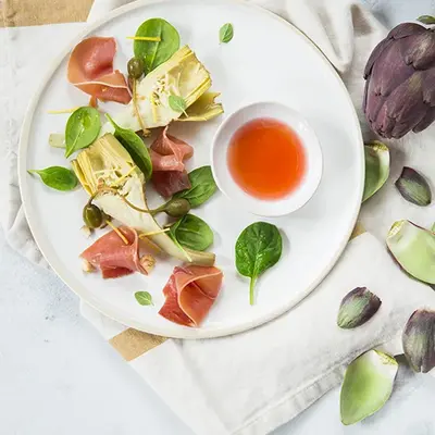 Salade d'artichauts marinés et jambon de Serrano dégraissé Aoste