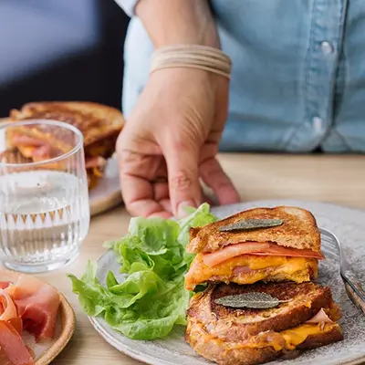 Grilled cheese, pain de campagne, jambon cru « les fines et fondantes » cheddar et chutney d’échalotes