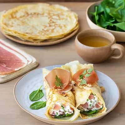 Crêpe fromage frais , grandes tranches de jambon cru Aoste et ciboulette