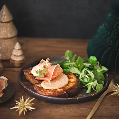 Brioche perdue foie gras et jambon cru Aoste