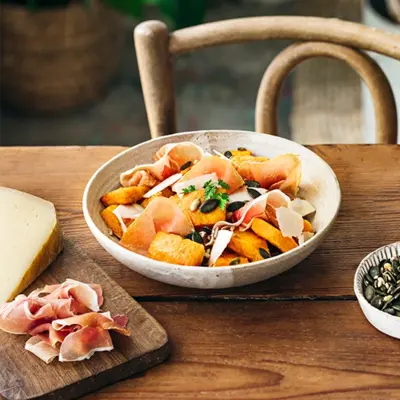 Salade de courge rôtie graines torréfiées, pecorino et jambon cru Aoste