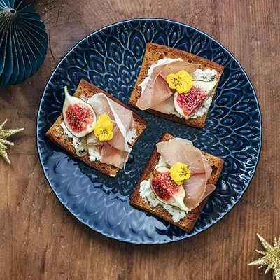 Tartines de pain d’épices, échalotes confites, chèvre frais, figues et volutes de jambon cru Aoste
