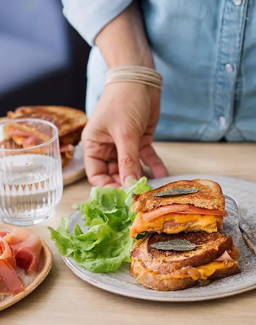 Grilled cheese, pain de campagne, jambon cru « les fines et fondantes » cheddar et chutney d’échalotes
