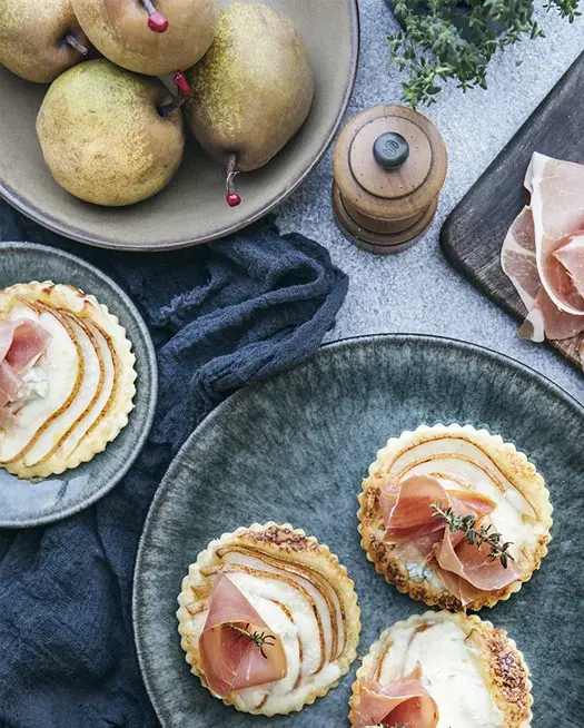 Tartelettes fines aux poires, gorgonzola et jambon cru Aoste