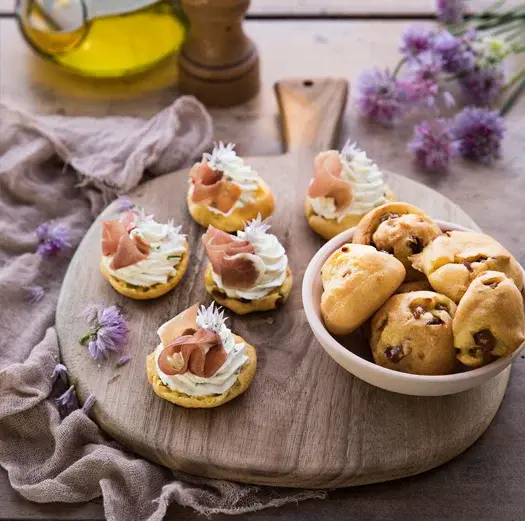 Gougères fromagères au jambon cru Aoste et crème montée à la ricotta